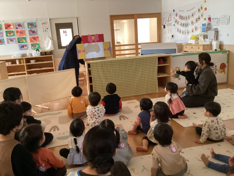 11月乳児誕生会では初めて🔰?の影絵を見ました。乳児さんでは(黒と白)などハッキリした明暗で、「何かな~」の問いかけに想像している可愛い考え中の、お子さんたちの姿があり、そばにいて下さる保護者の方も「○○だねぇ」と、お子さんを膝に入れながら一緒にたのしんでくださいました。