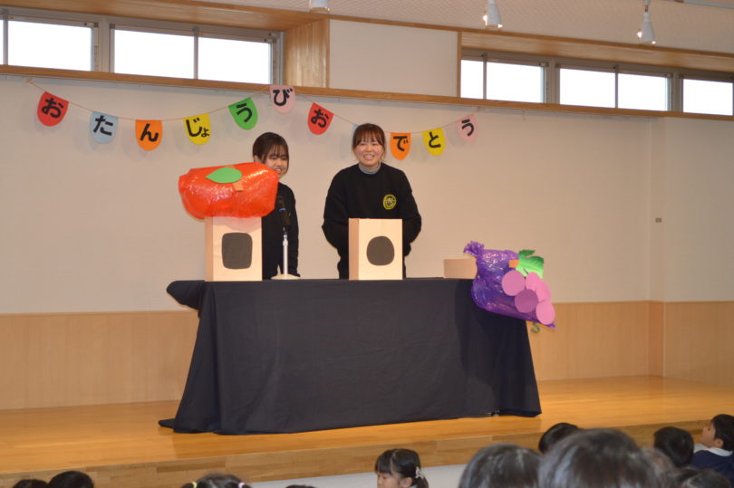 リンゴやぶどう、栗、柿も登場しました。最後には袋が膨らんでケーキが登場し、お誕生児の年長さんが飾りつけをしすてきなケーキが完成しました。
