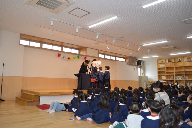 今月の出し物は「袋シアター」袋シアターって何でしょう?興味津々見ていると何やら箱が出てきました。箱のどこからか秋のおいしいものが出てくるらしいのです。「よいしょ、よいしょ」の掛け声とともに箱の上からのぷーっと袋が出てきてきました。そしておいしいものに大変身!